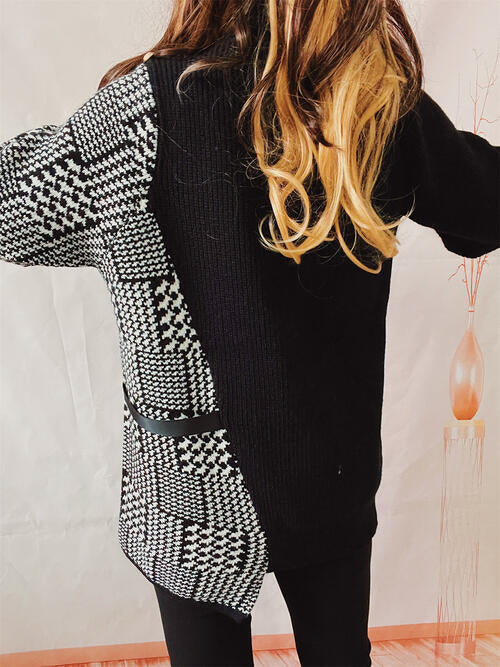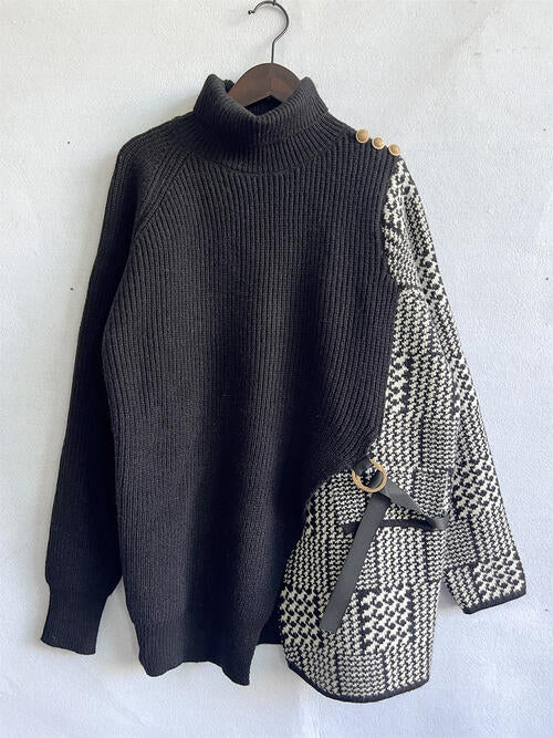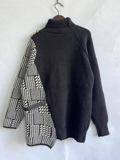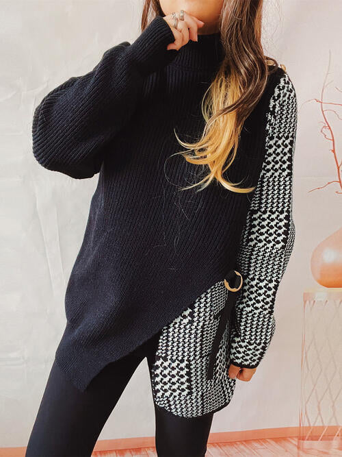 Houndstooth Turtleneck Long Sleeve Slit Sweater